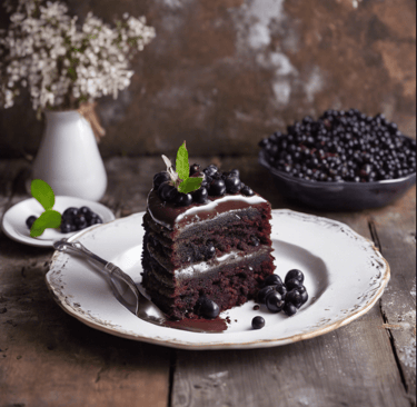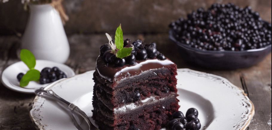 A delicious aronia chocolate cake with fresh aronia berries on top